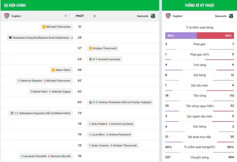 Trang cập nhật từng bàn thắng, từng thẻ vàng, từng pha thay người, giúp bạn nắm diễn biến nhanh và chính xác dù không xem trực tiếp.
